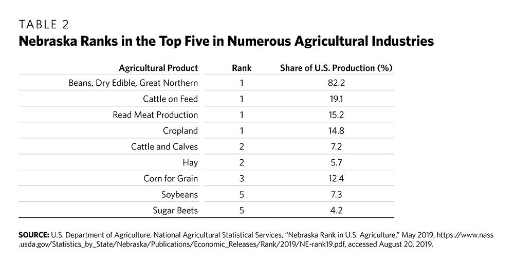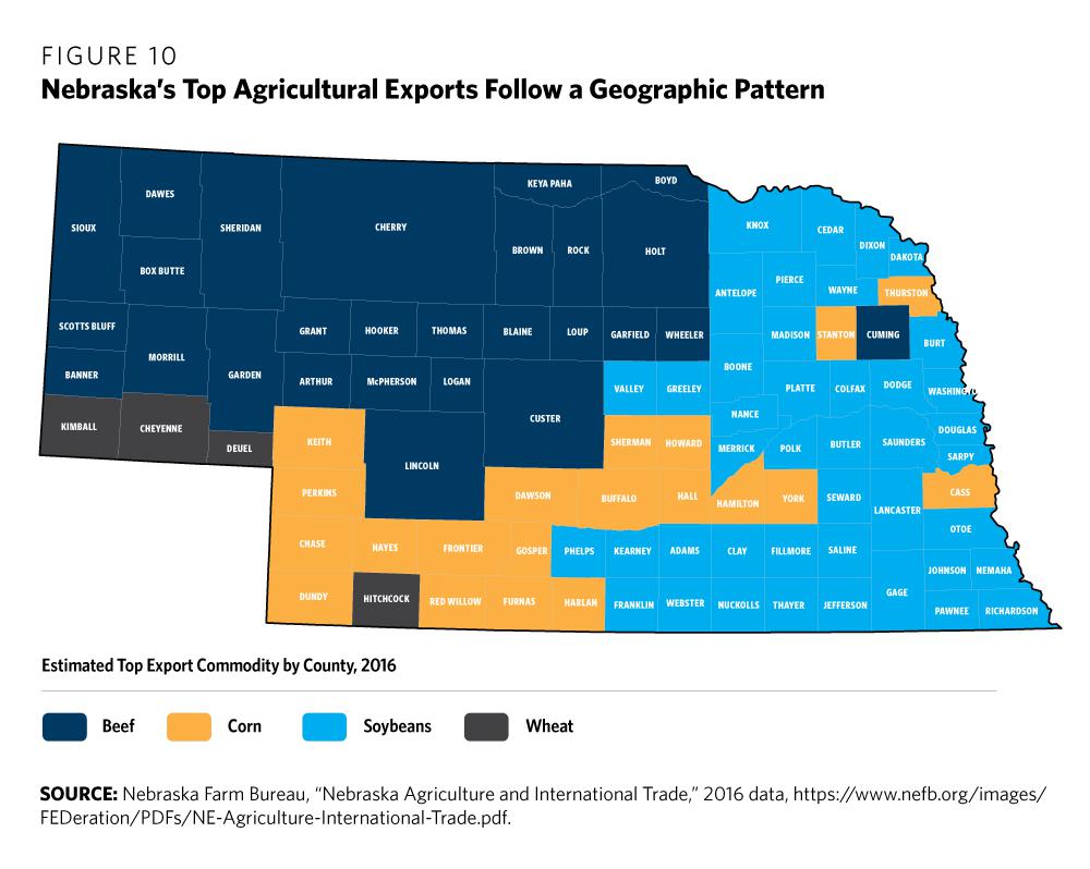 11 Nebraska Department of Economic Development and Nebraska Department of Agriculture, “Nebraska Exports,” using U.S. Census Bureau and U.S. Department of Agriculture’s Foreign Agricultural and Economic Research Services, updated October 10, 2019, https://opportunity.nebraska.gov/research/nebraska-exports/.