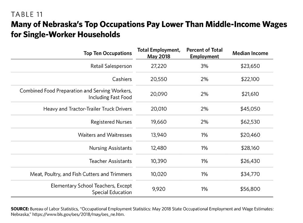 These realities may explain why so many Nebraskans consider themselves to be middle class, even though the wages for so many jobs in the state fall within the lower-income bracket (as discussed in the next chapter and Appendix C). Nebraskans are working more to make up the difference, and there are enough jobs available to do so.