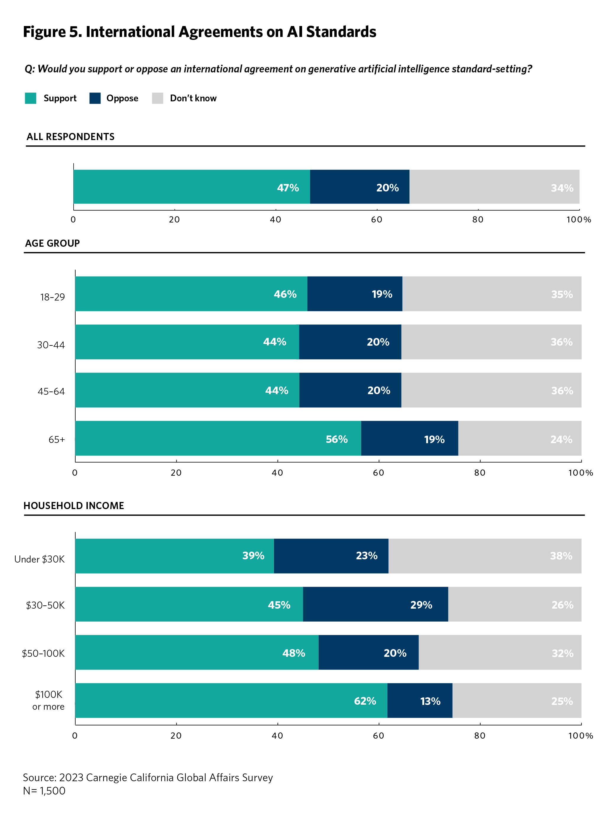 Forty-seven percent of Californians support an international agreement on AI standard setting; 20 percent oppose it, and 34 percent do not know. (see figure 5) Public support for an international agreement on AI increases with age and income. It also varies across parties (with 63 percent support among Democrats, 37 percent among Republicans, and 46 percent among independents) and increases with higher education.